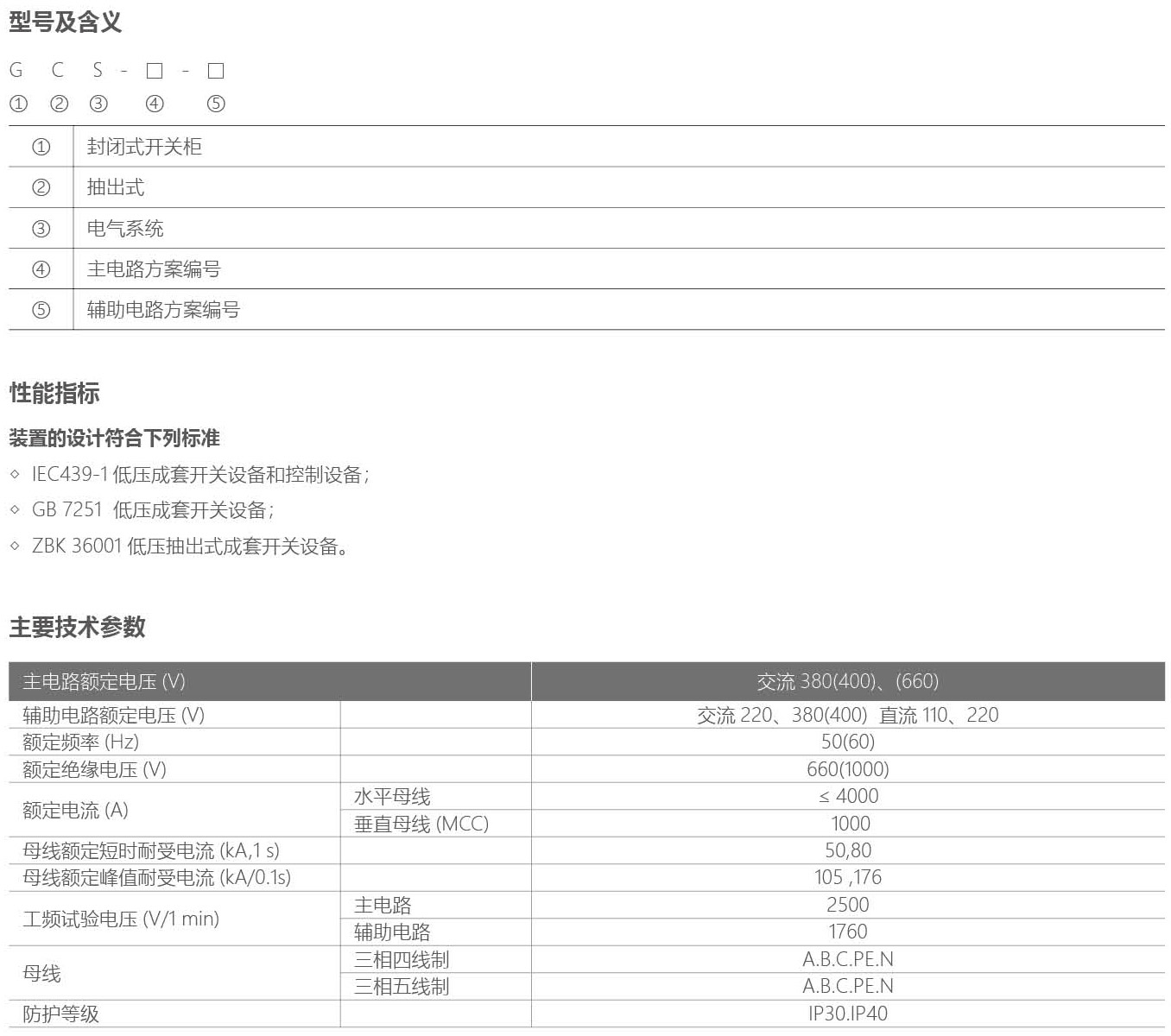 GCS 装置适用于发电厂、石油、化工、冶金、纺织、高层建筑等行业的配电系统。在大型发电厂、石化系统等自动化程度高,要求与计算机接口的场所,作为三相交流频率为 50(60)Hz,额定工作电压为 380V(400V),(660V),额定电流为 4000A 及以下的发、供电系统中的配电、电动机集中控制、无功功率补偿使用的低压成套配电装置。