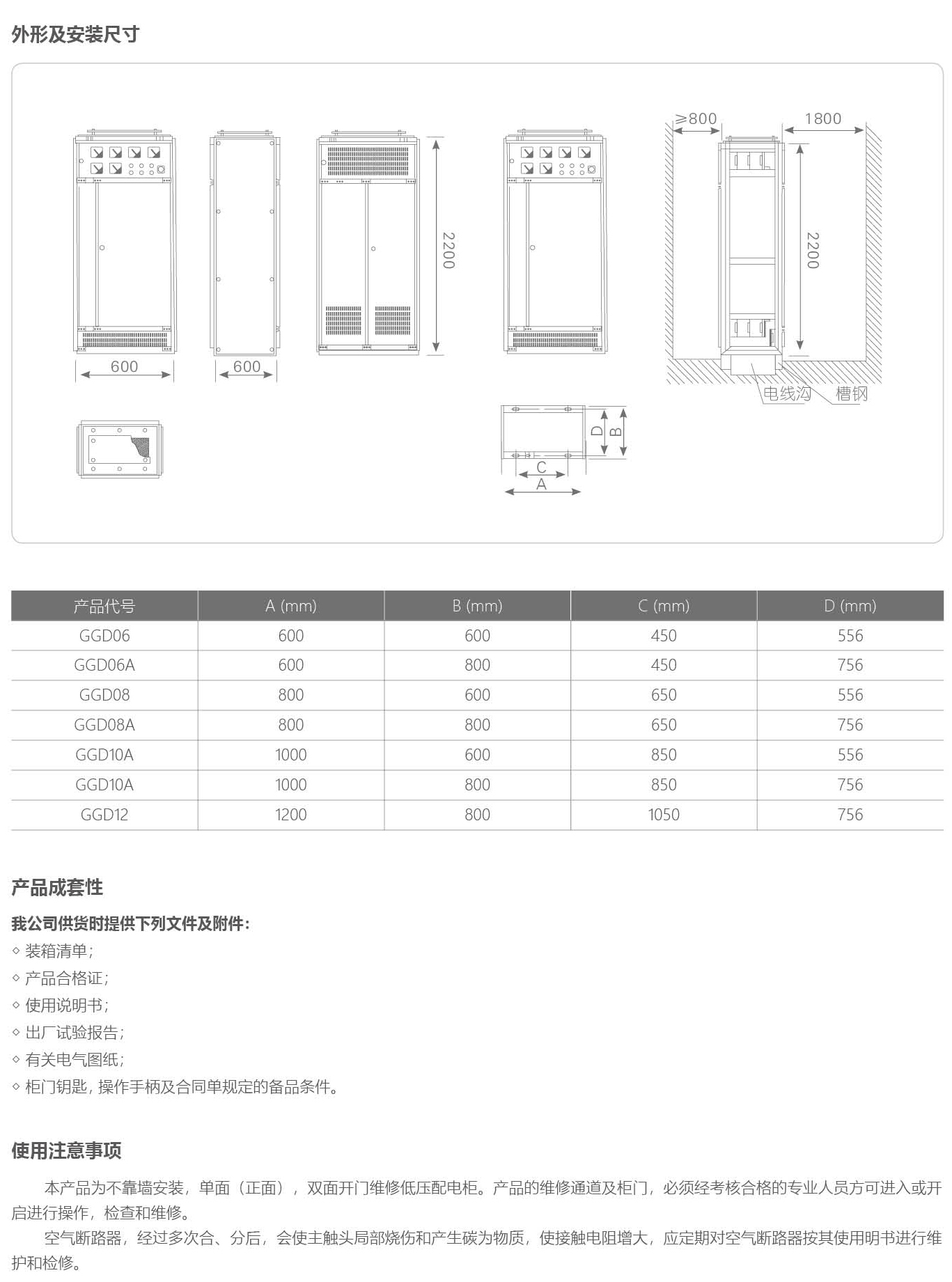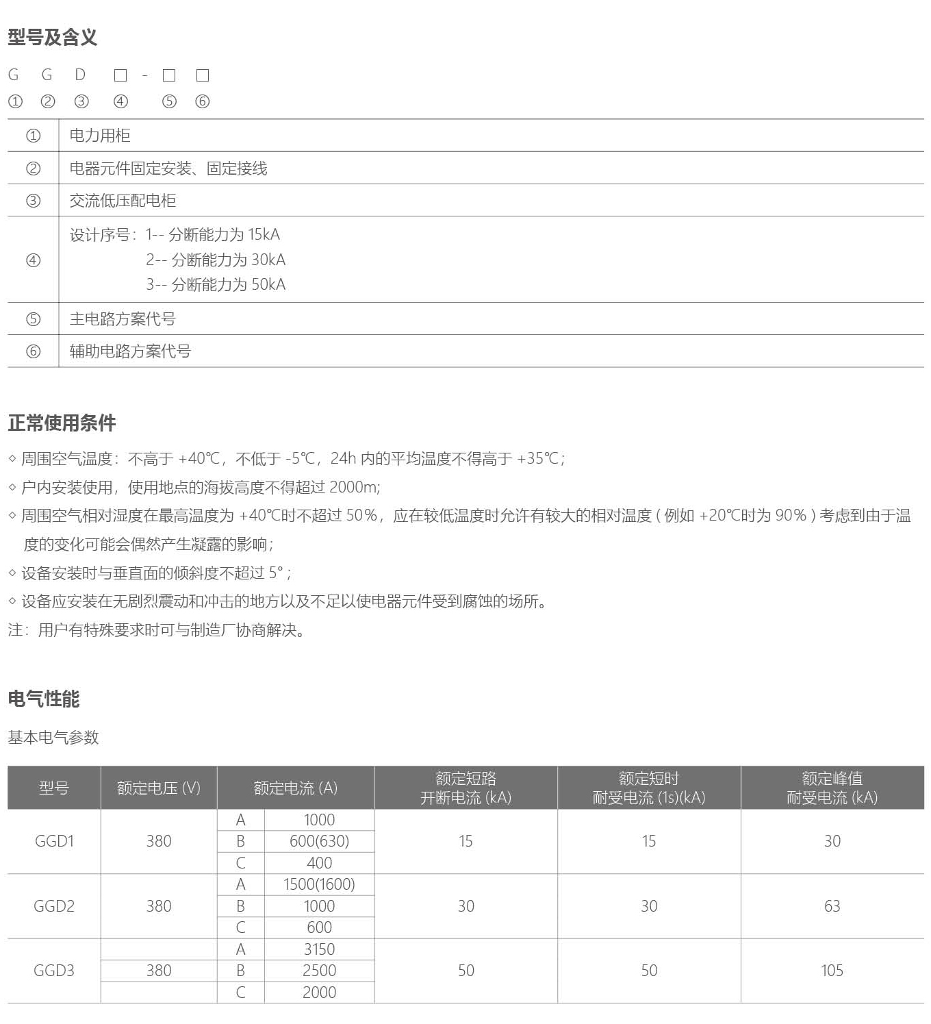 GGD 型交流低压配电柜是根据能源部主管上级与广大电力用户及设计部门的要求,本着安全、经济、合理、可靠的原则设计的新型低压配电柜。产品具有分断能力高、动热稳定性好、电气方案灵活、组合方便、系列性、实用性强、结构新颖、防护等级高等特点,可作为低压成套开关设备的更新换代产品使用。