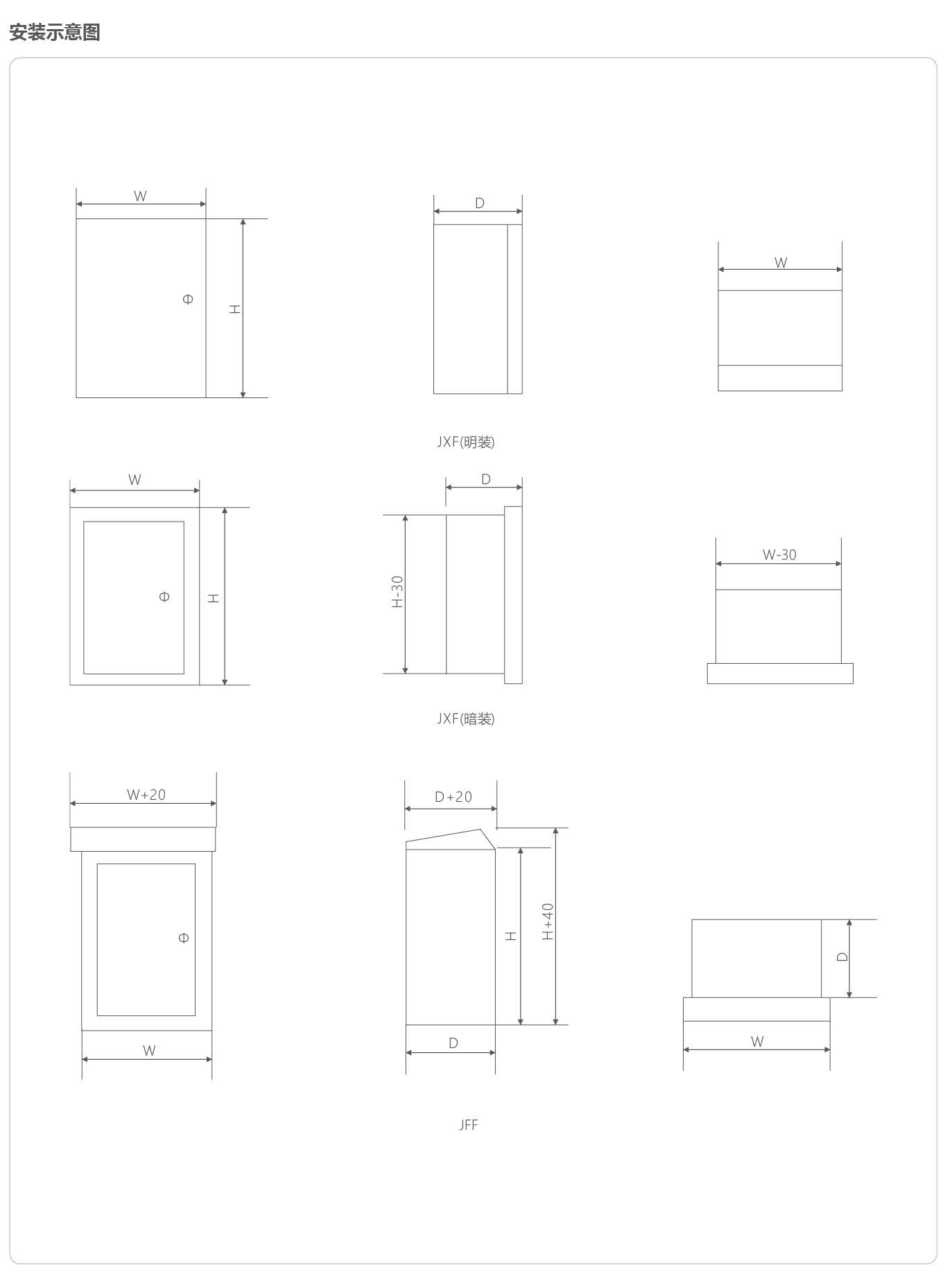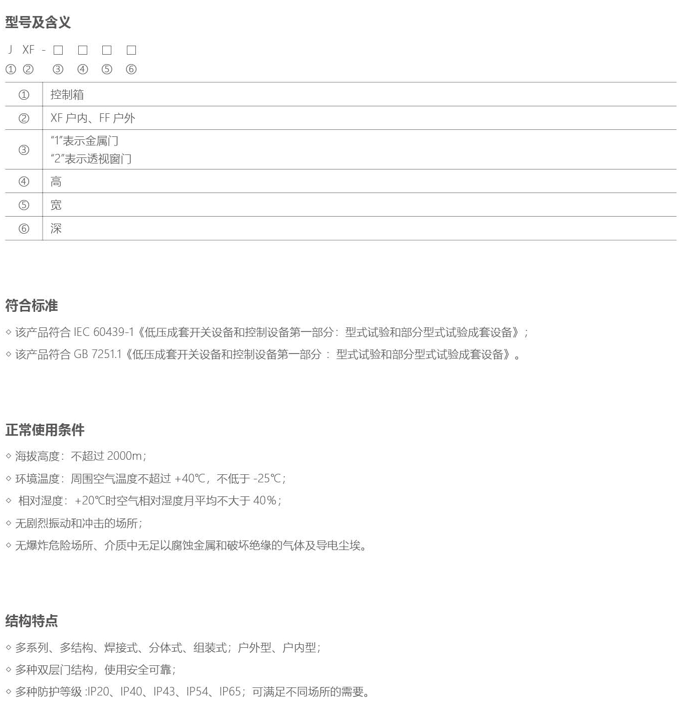 JXF 挂墙式低压动力控制箱适用于50Hz,500V及以下,负荷电流不大于250A的三相三线、三相四线、三相五线系统,对配电系统作控制、漏电保护以及电动机的过载、短路、缺相保护及各种控制。该箱设计合理,体积小、外形美观,使用安全可靠,广泛用于冶金,石化,医疗卫生、航空、住宅小区、商场、学校、城市改造。