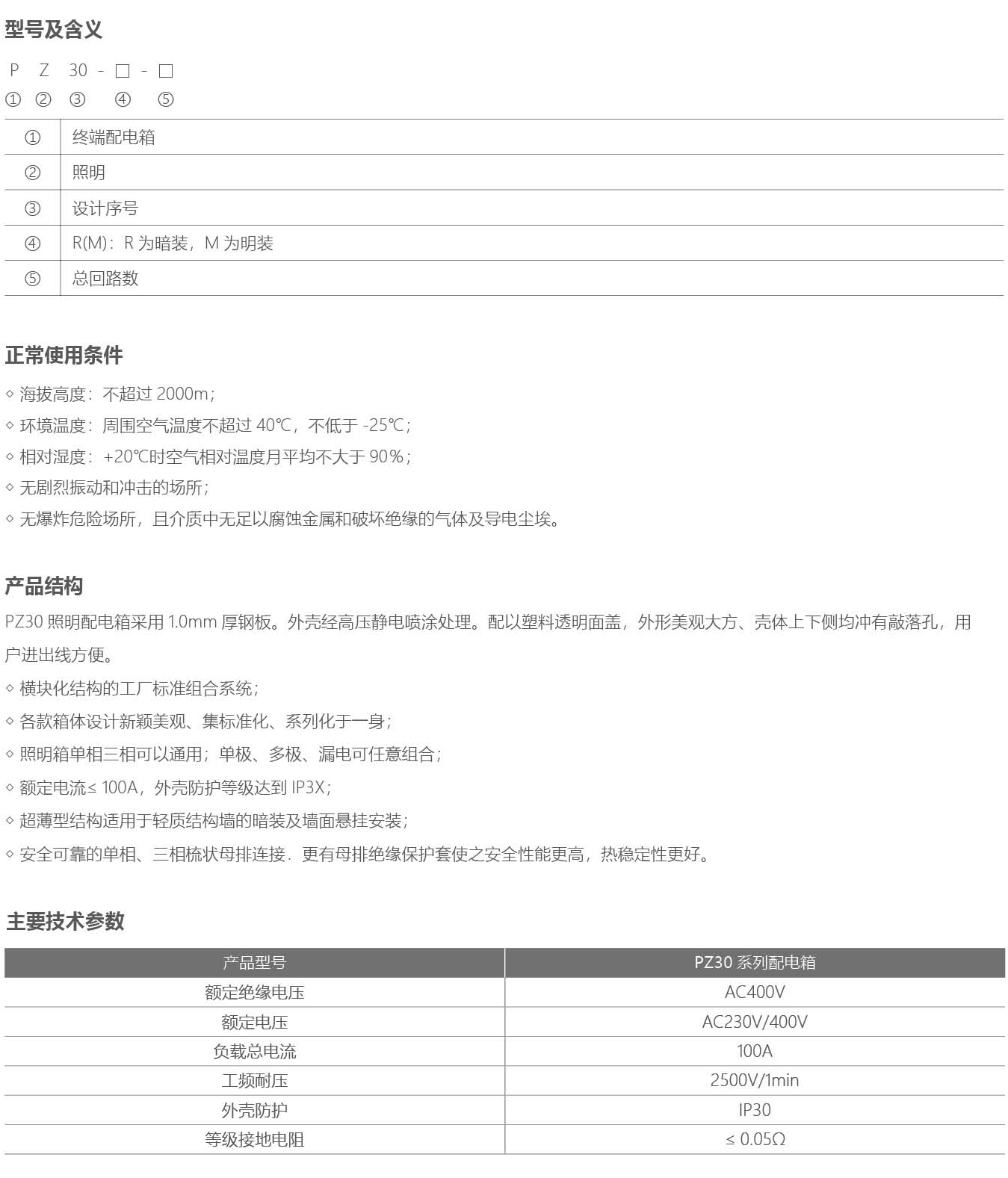 PZ30 照明配电箱适用于频率 50Hz, 额定电压 500V 及以下,负荷电流不大于 100A 的单相及三相电路中,作动力及照明、 电动机控制、对电路进行过载、漏电及短路保护。该箱设计合理、体积小,外形美观, 使用安全可靠,可广泛应用于工厂、大厦、住宅、商场等场所。