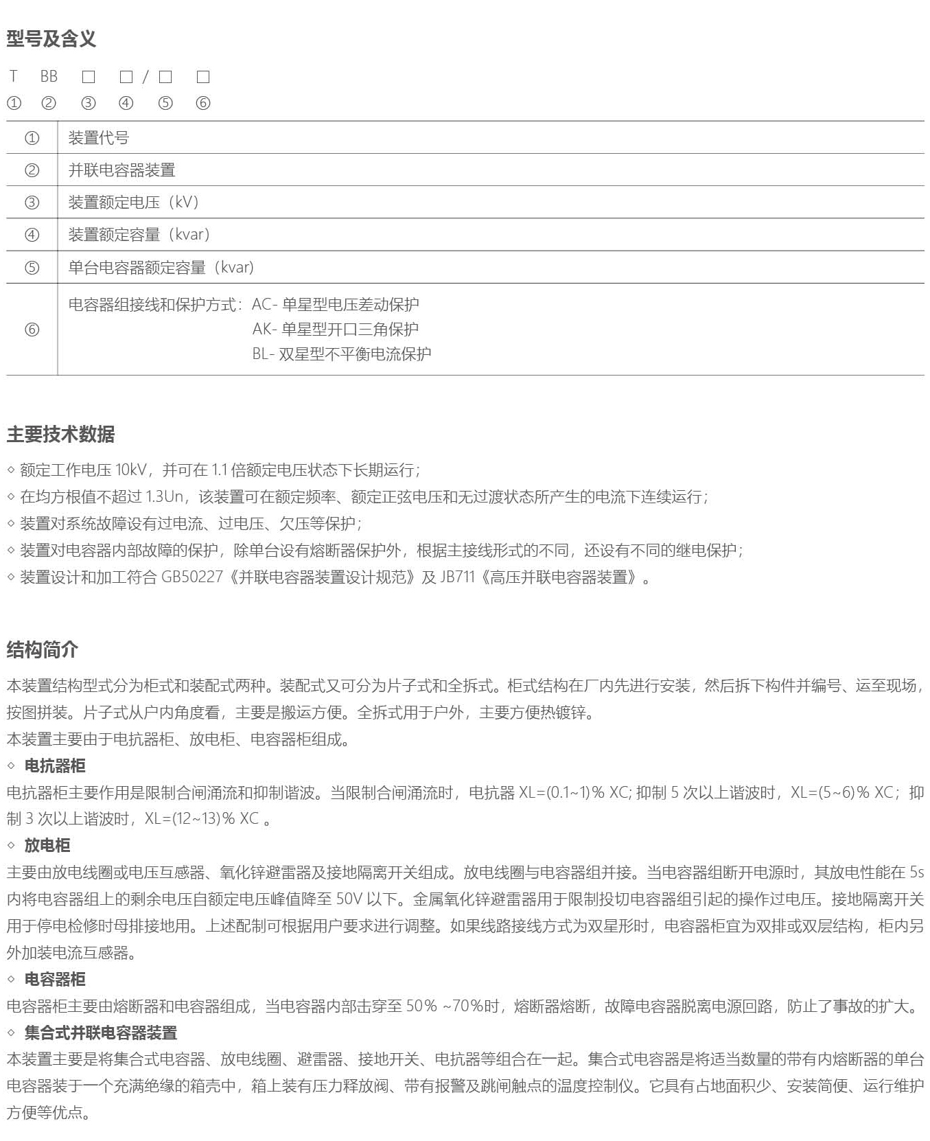 TBB 高压并联电容器装置(以下简称装置)适用于交流 50Hz、三相 10kV 电力系列中,用于提高功率因素和调整网路电压,从而提高供电设备有功输出和减少线路损耗。本装置为户内(外)式。