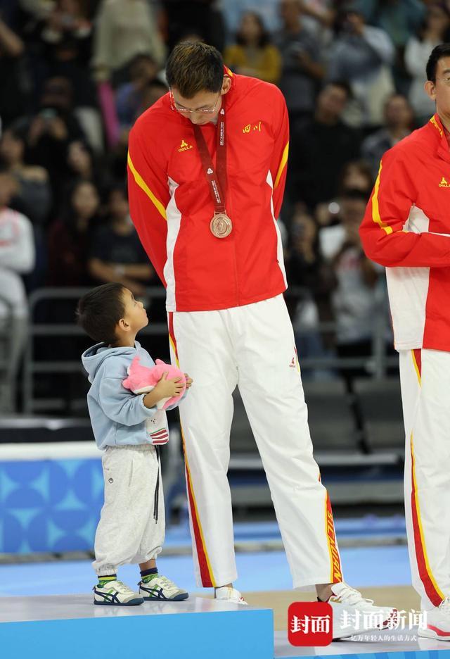 11月12日,在第十五届全运会男篮铜牌赛中,四川队以81比60大胜辽宁队夺得铜牌。赛后颁奖仪式上,代表四川男篮出战的周琦牵着小儿子涂涂登上领奖台,画面温馨有爱。