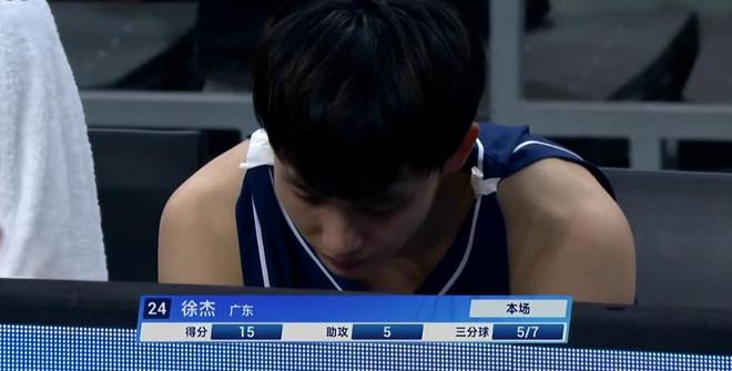 第二节中段,先前4中0的胡明轩终于投进打板三分有所贡献,杜锋趁热打铁换上刘传兴,丁伟也换上有伤在身走路一瘸一拐的程帅澎(这是招败笔),接下来广东队进攻全面复苏,大刘上来就有贡献制造2+1,贺希宁也成功打出转换,4分30秒徐杰再中三分,广东队一波11-1领先来到40-28。