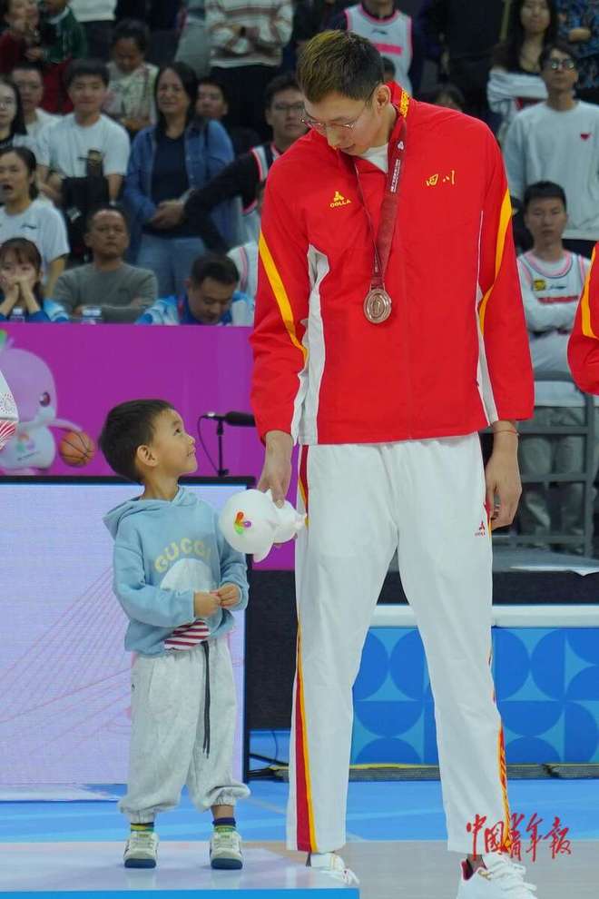 11月12日,广东东莞,东莞篮球中心,十五运会篮球男子成年组颁奖仪式,四川队周琦将本届全运会吉祥物喜洋洋送给自己孩子。四川队在铜牌赛中,以81:60战胜辽宁队,取得季军。中青报·中青网记者 田嘉硕/摄