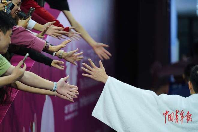 11月12日,广东东莞,东莞篮球中心,十五运会篮球男子成年组铜牌赛后,一名球员在球员通道与球迷击掌。中青报·中青网记者 田嘉硕/摄