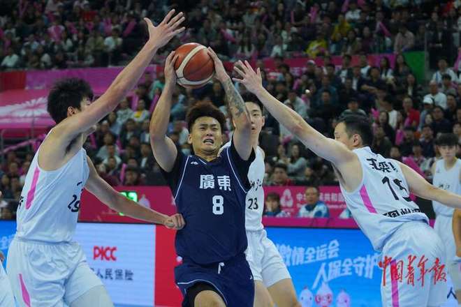 11月12日,广东东莞,东莞篮球中心,十五运会篮球男子成年组决赛,广东队赵睿(中)在对方的包夹中寻求突破。中青报·中青网记者 田嘉硕/摄