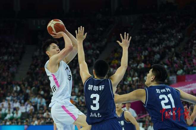 11月12日,广东东莞,东莞篮球中心,十五运会篮球男子成年组决赛,浙江队朱俊龙(左)翻身跳投。中青报·中青网记者 田嘉硕/摄