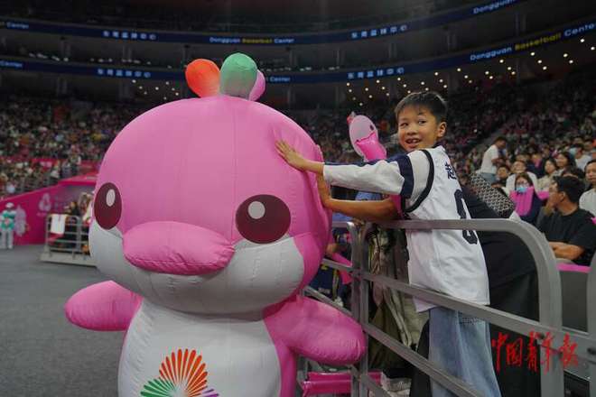 11月12日,广东东莞,东莞篮球中心,十五运会篮球男子成年组决赛前,一名小球迷抚摸本届全运会吉祥物乐融融。中青报·中青网记者 田嘉硕/摄