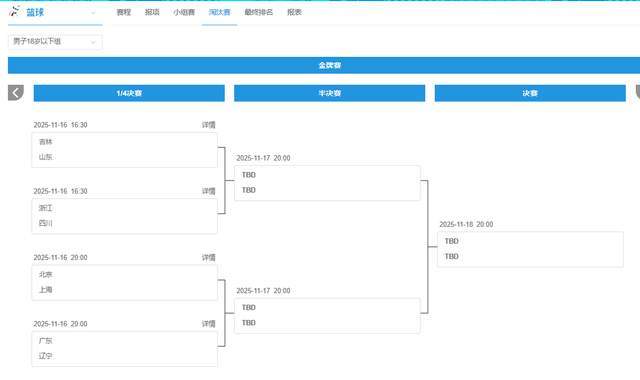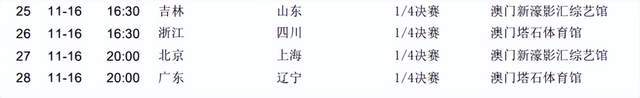四分之一决赛的对阵也随之出炉了,山东和浙江进入上半区。广东和上海进入下半场。11月16日下午16:30,山东队将对阵吉林队,四川队对阵浙江队。晚上20点,上海队对阵北京队,广东队对阵辽宁队。