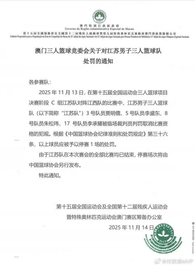 值得一提的是,本次全运会三人男篮比赛裁判成了话题,昨天江苏全队被夺权罚出,今天竞委会对江苏做出了处罚通知。