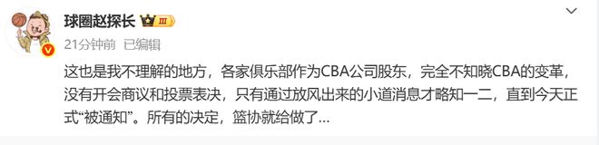 根据赵探长转发的内容,他表示:各家俱乐部作为CBA公司股东,完全不知晓CBA的变革,没有开会商议和投票表决,直到今天正式“被通知”。所有的决定,篮协就给做了…。这样的动态就非常明确了,这次潜力赛的比赛,只是CBA这边自己认为,并没有开会确定。我相信各个球队在看到这样的决定之后都懵了。