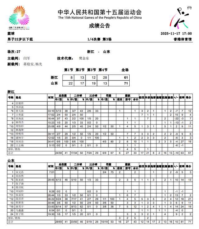 北京时间11月17日,第十五届全运会U22男篮四分之一决赛火热进行中,山东U22男篮与浙江队争夺一个4强席位。经过4节较量,山东U22男篮以71-61击败浙江队,顺利打进4强,巩晓彬距离金牌又近了一步。不过,在第四节,山东队单节输了15分之多,实属不应该,巩晓彬需要给队员们上紧发条才行。段昂君21分5篮板5助攻,陈家政11分3篮板。