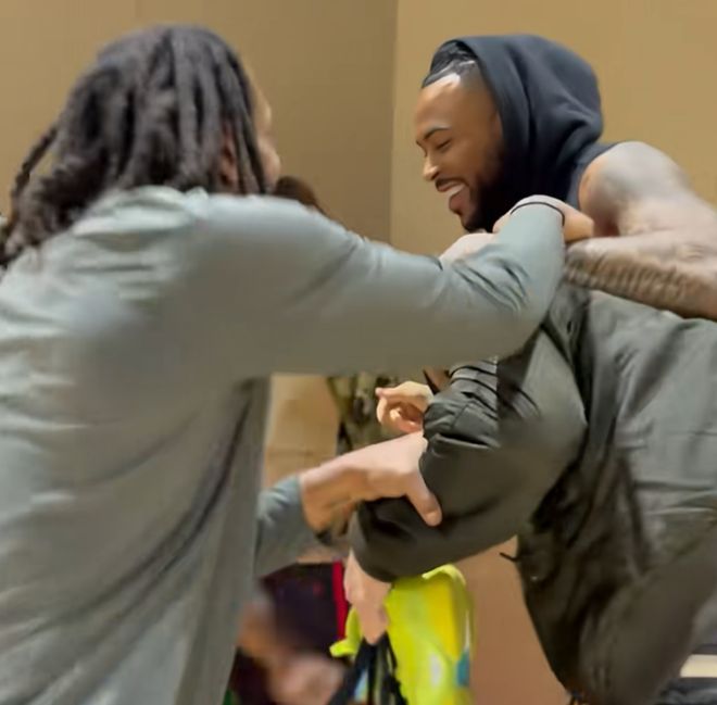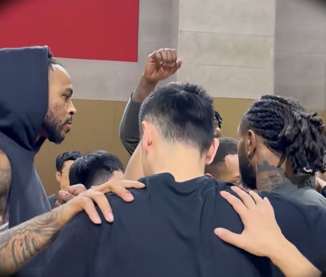 付豪也是一大热门。当莫兰德、威尔斯与奥利弗看到付豪的时候,三个人死死将其围住,然后摸他头,他的人气好像是队内最高的了。