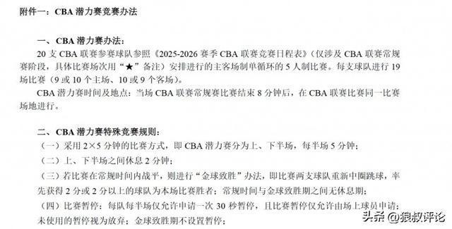 媒体人付政浩发文点评:“CBA 潜力赛采用 2×5 分钟的比赛方式,即 CBA 潜力赛分为上、下半场,每半场 5 分钟。若比赛在常规时间内战平,则进行“金球致胜”办法,即比赛两支球队重新中圈跳球,率先获得 2 分或 2 分以上的球队为本场比赛胜者;常规时间与金球致胜期之间无休息期。
