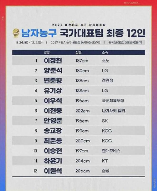 韩国男篮公布12人大名单!基本是最强阵容,郭士强抓住内线优势