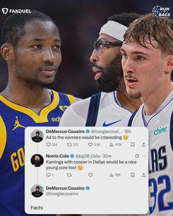 浓眉哥老搭档&前NBA第一中锋考辛斯对此发推道:“戴维斯去勇士的话会很有趣。”
