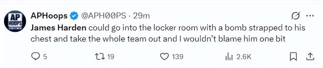 美媒APHoops:即使詹姆斯-哈登即便胸口绑着炸弹走进更衣室,然后炸掉全队,我也不会因此责怪他半分。
