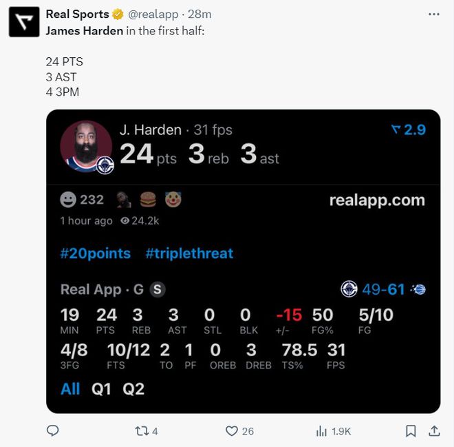 快船记者Joey Linn:这并不是哈登表现最好的上半场,但对于糟糕的快船来说是,进攻端全靠他一人,其他人根本无法提供半分帮助。