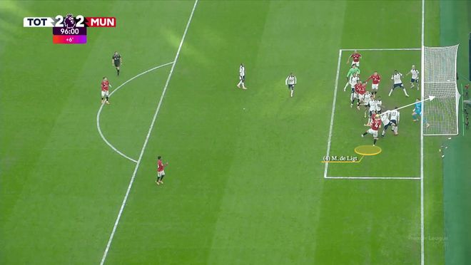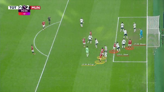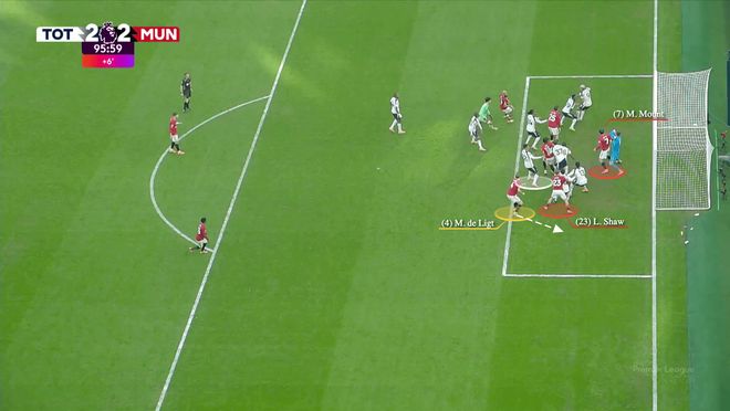 一旦曼联队长开出角球,德利赫特改变方向冲向后点,约罗移向中央区域,芒特则卡在了热刺门将维卡里奥的身前。