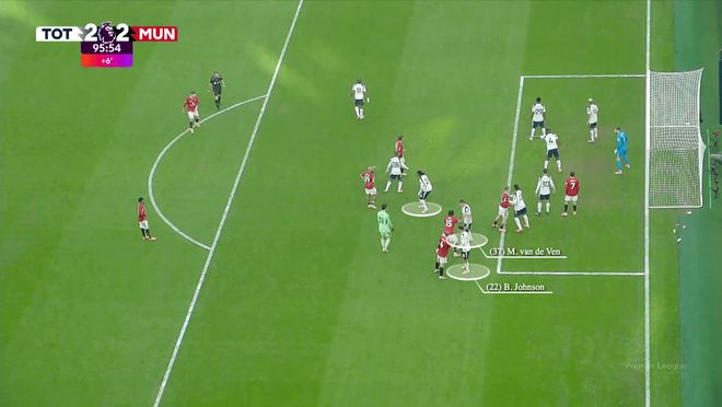 在导致曼联最后时刻扳平比分的那个角球中,热刺采用混合防守体系:马蒂斯-特尔在点球点附近防守短角球选项或任何后插上的球员,奥多贝尔保护小禁区外围空间,小禁区内有五名区域防守球员,三名人盯人防守球员(白色标记)盯防后点。