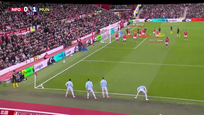 当布鲁诺-费尔南德斯开始助跑时,德利赫特(红色)向对方门将泽尔斯移动,而卢克-肖则靠近耶茨。谢什科(黑色)准备攻击后点。