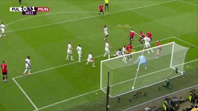 当姆伯莫将内旋角球开向后点时,卢克-肖在那个区域牵制住了富勒姆的区域防守球员罗德里戈-穆里斯。相应地,约罗在目标区域内与巴锡形成一对一。
