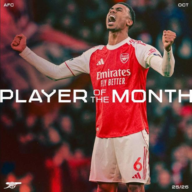 加布里埃尔被我们的球迷投票选为10月份最佳球员,他获得了45%的选票,击败了赖斯、廷贝尔和萨卡,这是他在枪手生涯中第6次获得该奖项,也是他在2025年的第二次获奖(第一次是在一月)。