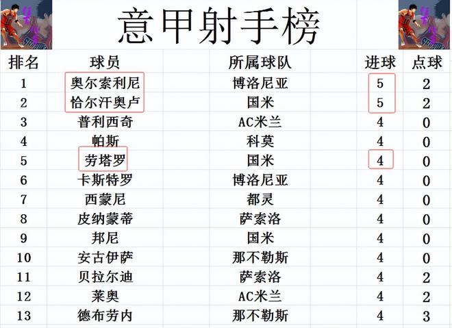 射手榜方面,意甲本赛季的射手是集体提米,奥尔索利尼和恰尔汗奥卢今天都没有进球,打入5球的他们就还能守住榜首位置,四大联赛也就只有意甲没有射手进球上双。劳塔罗,邦尼破门,追上普利西奇,莱奥,德布劳内等人,4球并列第3。