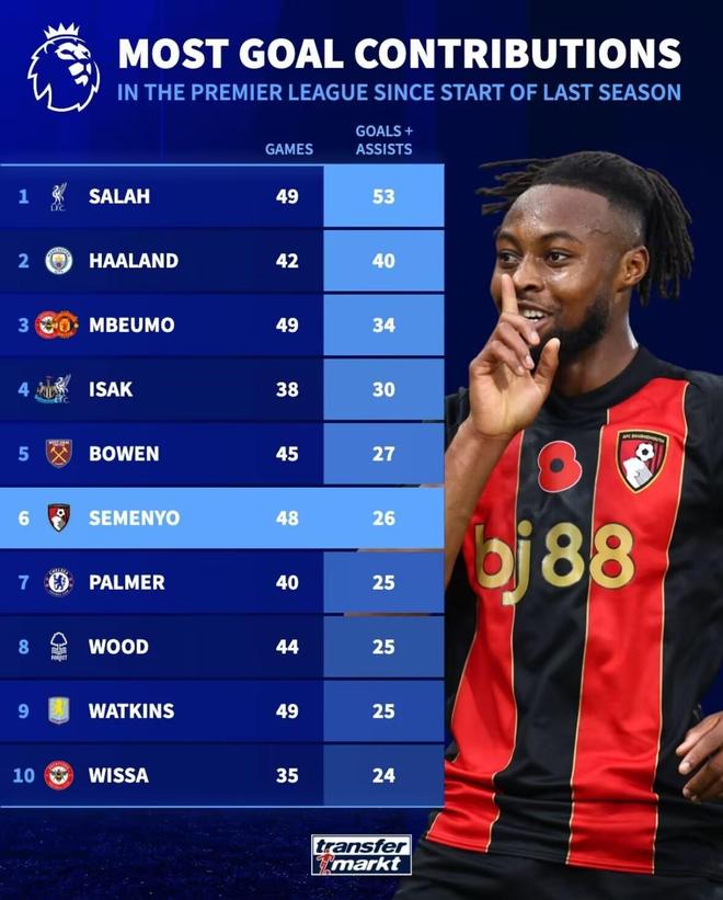 塞门约本赛季参与进球率英超第二,上赛季至今参与进球数第六